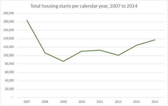 The number of starts in 2014 was the highest annual total since 2007. The total was 36% on 2012 and 59% on the trough in 2009.