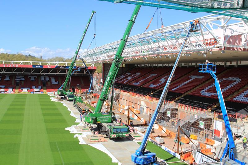 Mike Henderson, operations manager for Barr Construction, said: “The design has had to take in a lot of difficult parameters. From working with the existing Dolman roof to the new South Stand, we’ve had to work to tight tolerances of 10mm at each end of the truss. When you consider that it is 106-metres long and weighs 75 tonnes it’s not an easy piece of steel to slot in to place, but it was a momentous occasion to see that it has.”