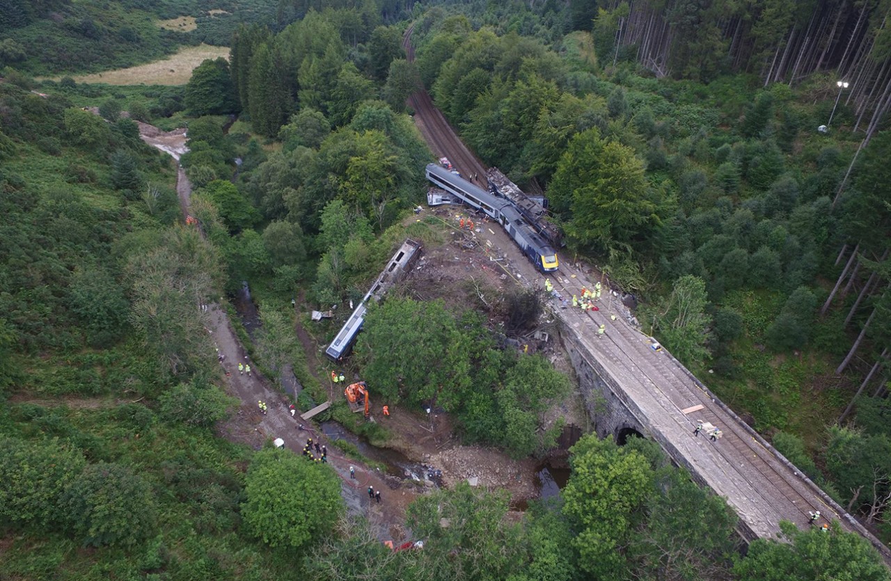 At around 09:37 hrs on Wednesday 12th August 2020, a passenger train derailed near Carmont, Aberdeenshire. The train was travelling at 73mph, just under the normal speed for the line concerned. After derailing, the train deviated to the left, before striking a bridge parapet which caused the vehicles to scatter. Three people died as a result of the accident and the remaining six people on the train were injured.