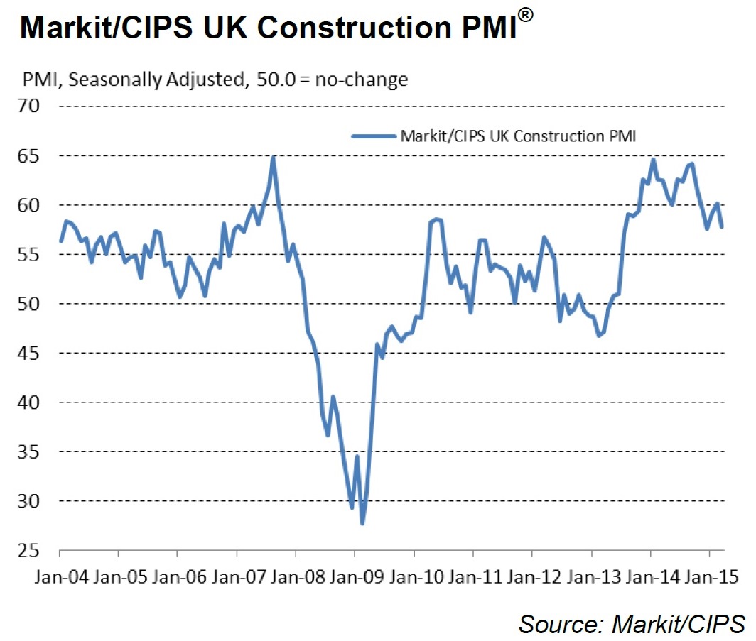 The headline seasonally adjusted Markit/CIPS UK Construction Purchasing Managers’ Index (PMI) posted a score of 57.8 in March, down from 60.1 in February and the lowest for three months, but still well above the 50.0 no-change value.
