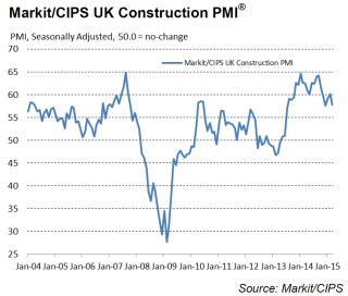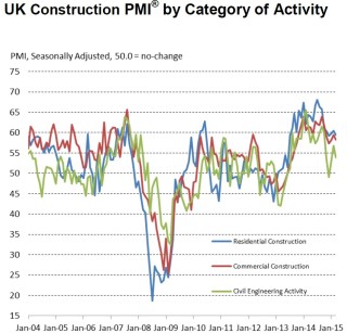 As a result, the latest reading pointed to a strong rate of overall construction output growth, albeit one that was below the average for 2014 as a whole (61.8).