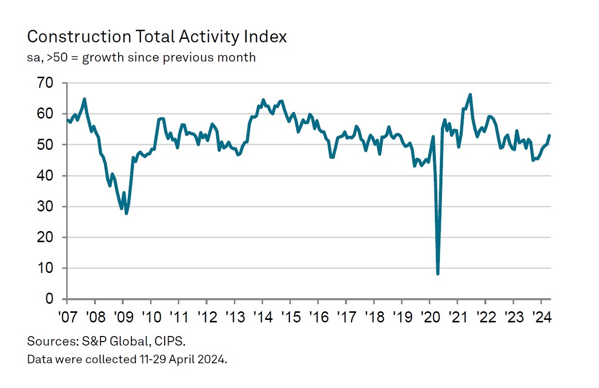 At 53.0 in April, up from 50.2 in March, the headline S&P Global UK Construction Purchasing Managers’ Index (PMI) – a seasonally adjusted index tracking changes in industry activity – registered in positive territory for the second month running and signalled the strongest pace of expansion since February 2023.