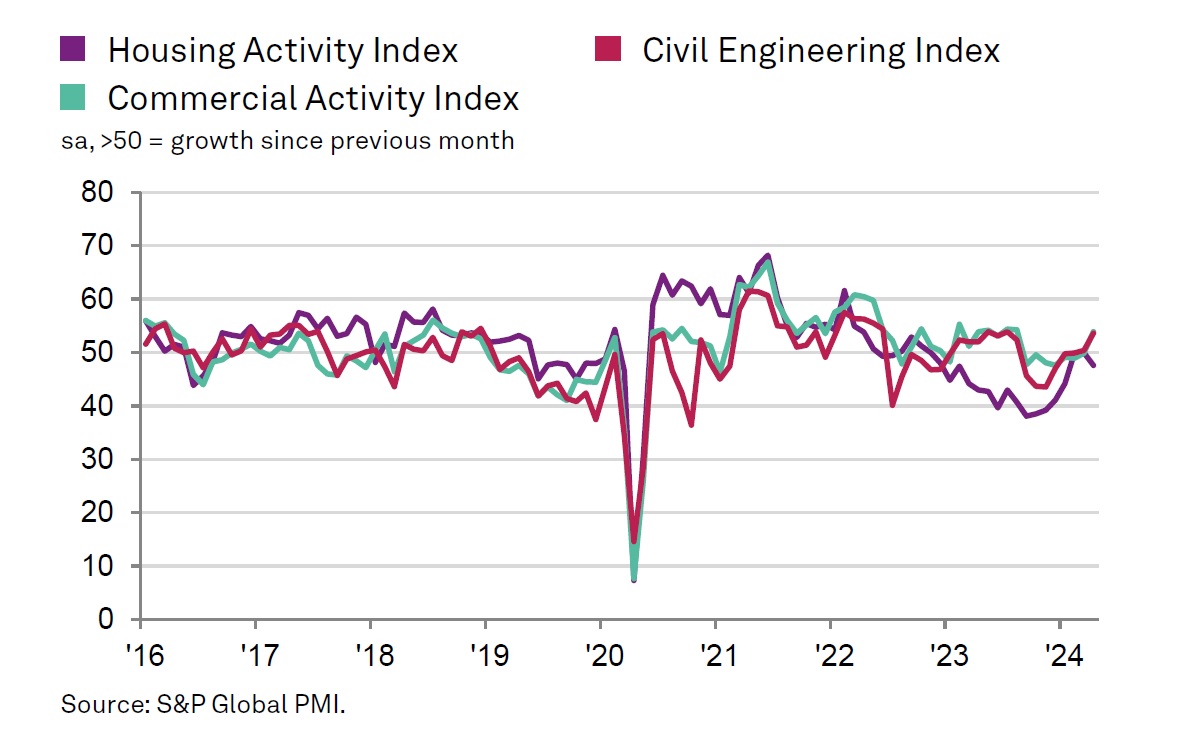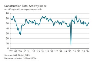 Commercial building (index at 53.9) increased for the first time since August 2023 and was the fastest-growing area of construction activity in April. Survey respondents commented on rising workloads and a turnaround in customer demand, in part driven by refurbishment projects.