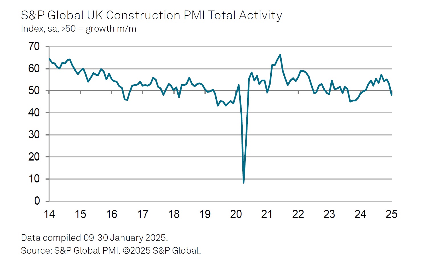 At 48.1 in January, down significantly from 53.3 in December, the headline seasonally adjusted S&P Global UK Construction Purchasing Managers’ Index (PMI) registered below the 50.0 no-change threshold for the first time since February 2024. (Anything above 50.0 indicate growth; below indicates dwindling output.)