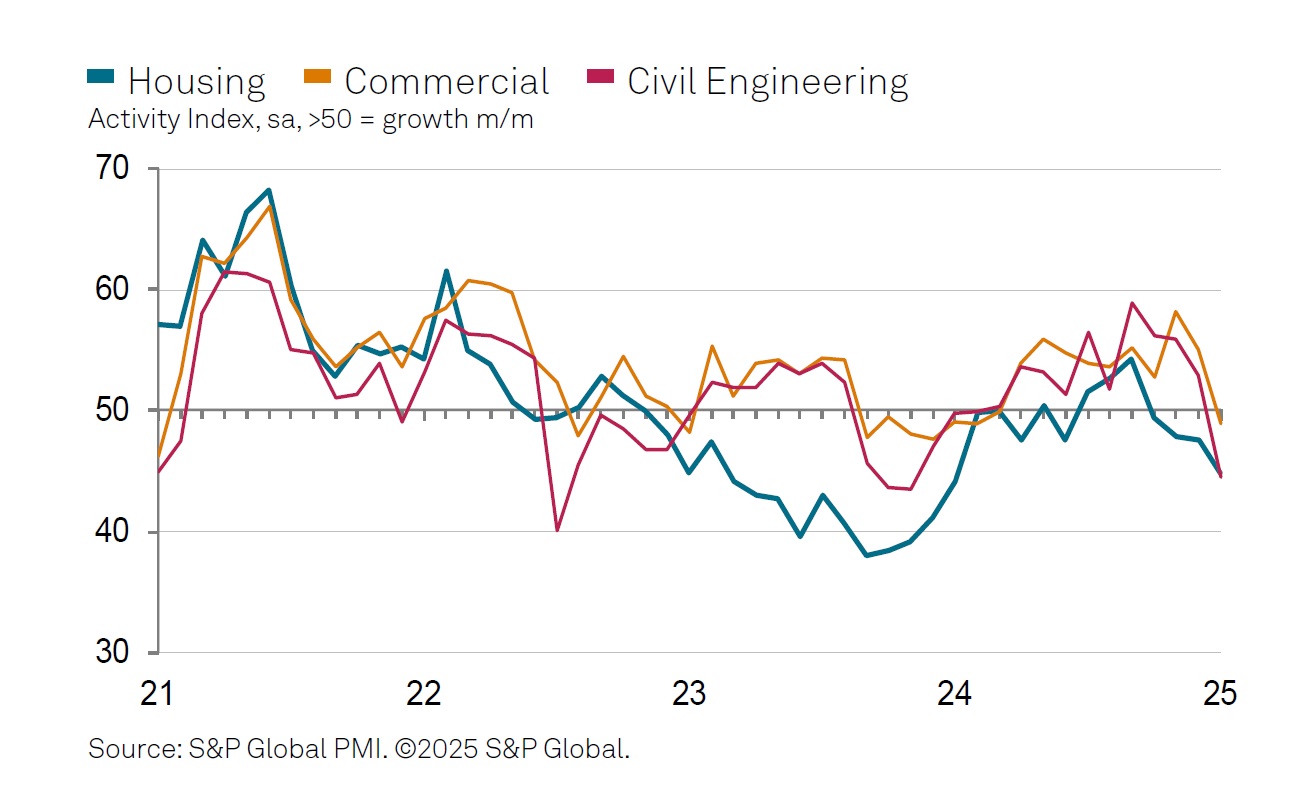 "Construction firms noted the fastest fall in residential work for 12 months as market conditions remained somewhat subdued. Anecdotal evidence suggested that caution regarding demand for new projects was prevalent at the start of 2025, despite strong policy support for house-building and hopes for a longer-term boost to supply via planning reform.