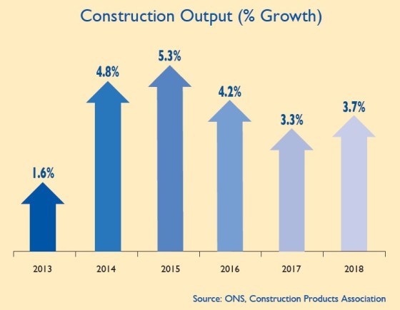 The Construction Products Association autumn forecasts predict that construction output will grow 4.8% in 2014 and 5.3% in 2015, before slowing a little to 4.2% in 2016. The 2015 figure represents a firm upward revision from its previous forecast of 4.8% growth.