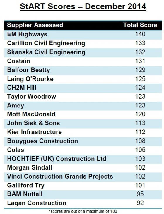 Bringing up the rear were: Galliford Try on 101, BAM Nuttall on 95; and Lagan Construction with 92.