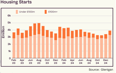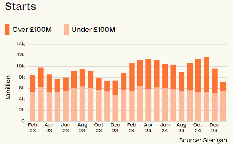 According to data gathered by construction market analysts Glenigan, there was some growth in the number of smaller developments starting on site between November 2024 and January 2025, but few schemes worth more than £100m breaking ground.