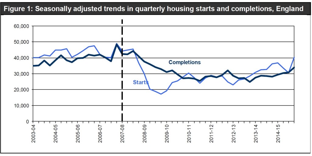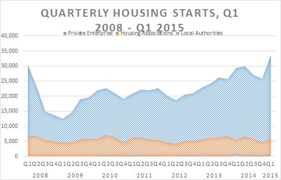 Seasonally adjusted house building starts in England are estimated at 40,300 for the first three months of 2015, the highest quarterly number since 2007.