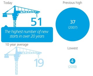 Collectively, the 51 new starts will provide an additional 4.8 million sq ft of space, an increase of 58% on the volume of new starts recorded just six months ago. “While our previous reports had already pointed to a new wave of construction, the current activity does not include some large schemes that we have been tracking, but which had not officially begun at our survey cut-off date,” said Deloitte. “Had these developments been included, the record result would have been even higher.”