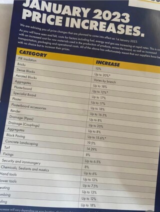 Aerated blocks, plaster and roofing materials are increasing by up to 18%; plasterboard and specialist board by up to 17%.