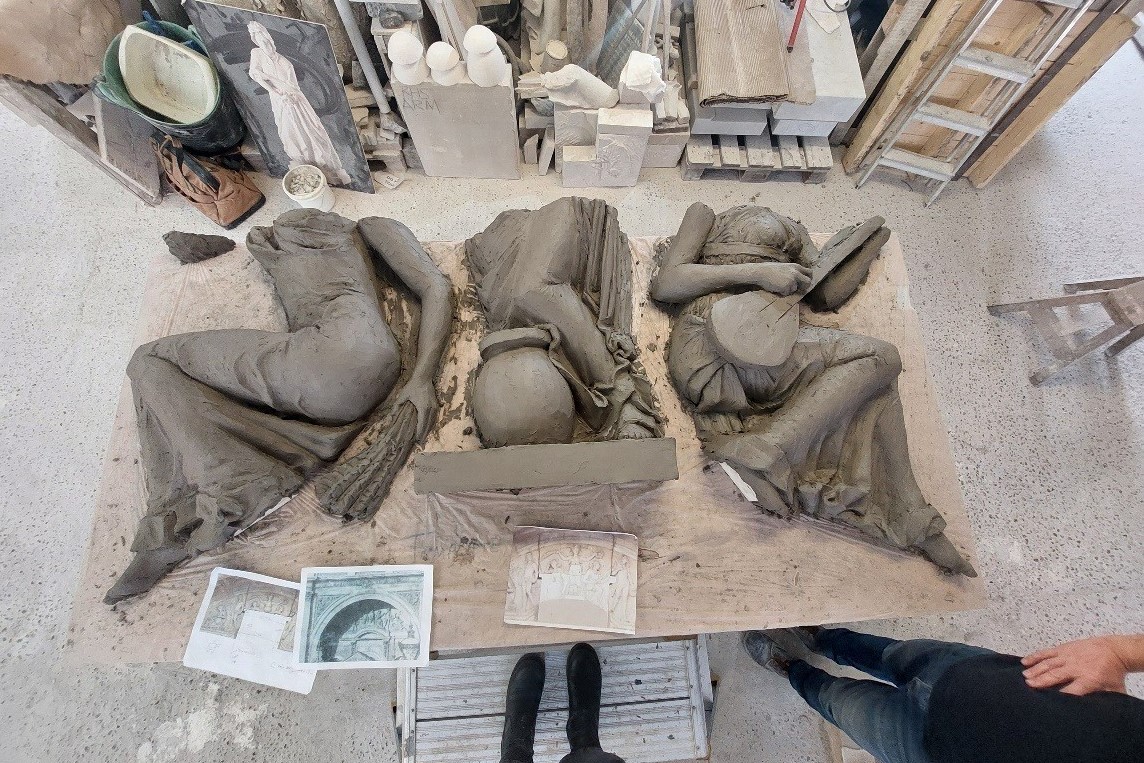 Working with stone carver Simon Smith, DBR has completed the research and design phase, resulting in detailed drawings and clay maquettes. The maquettes, approved by The London Borough of Hammersmith & Fulham, have been digitally scaled and produced in plaster to guide the next phase: carving Portland stone blocks, with each block inspected and chosen at quarry for its quality. Once carved, these pieces will be installed by DBR’s masons.