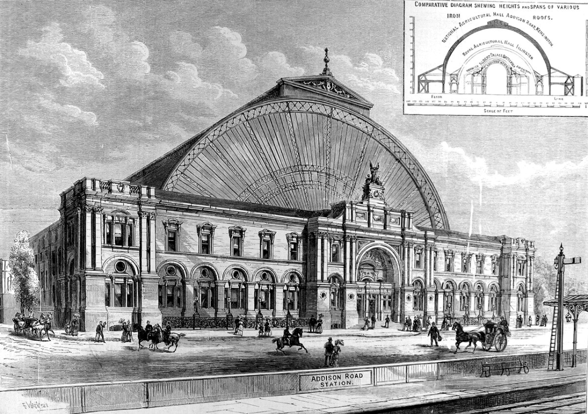 Constructed in 1886 as the National Agricultural Hall and later renamed Olympia, the venue’s original entranceway had a red brick and Portland stone façade with sculptures evoking Greek mythology, including Demeter, goddess of agriculture, with her daughter Persephone and companion Triptolemus on top of the building. It also included a frieze below the arch, depicting Nike, goddess of victory, as its central figure.