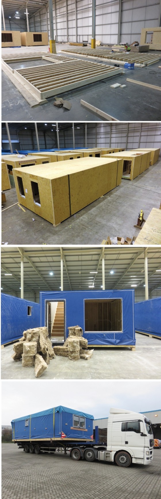 The bulk of the pre-fabrication work was carried out in a pop-up factory in Livingston (see below), where the homes were assembled into an entire module per floor, complete with windows, doors, finishing joinery and an undercoat of paint. These were then transported to site, where they were lifted into place by a crane.