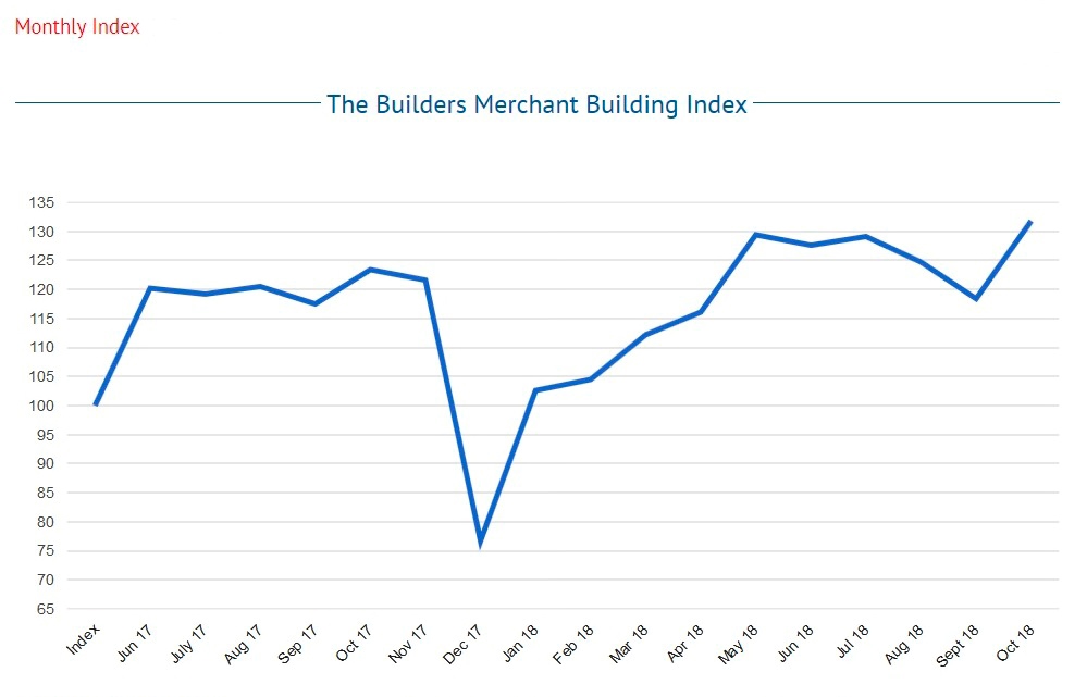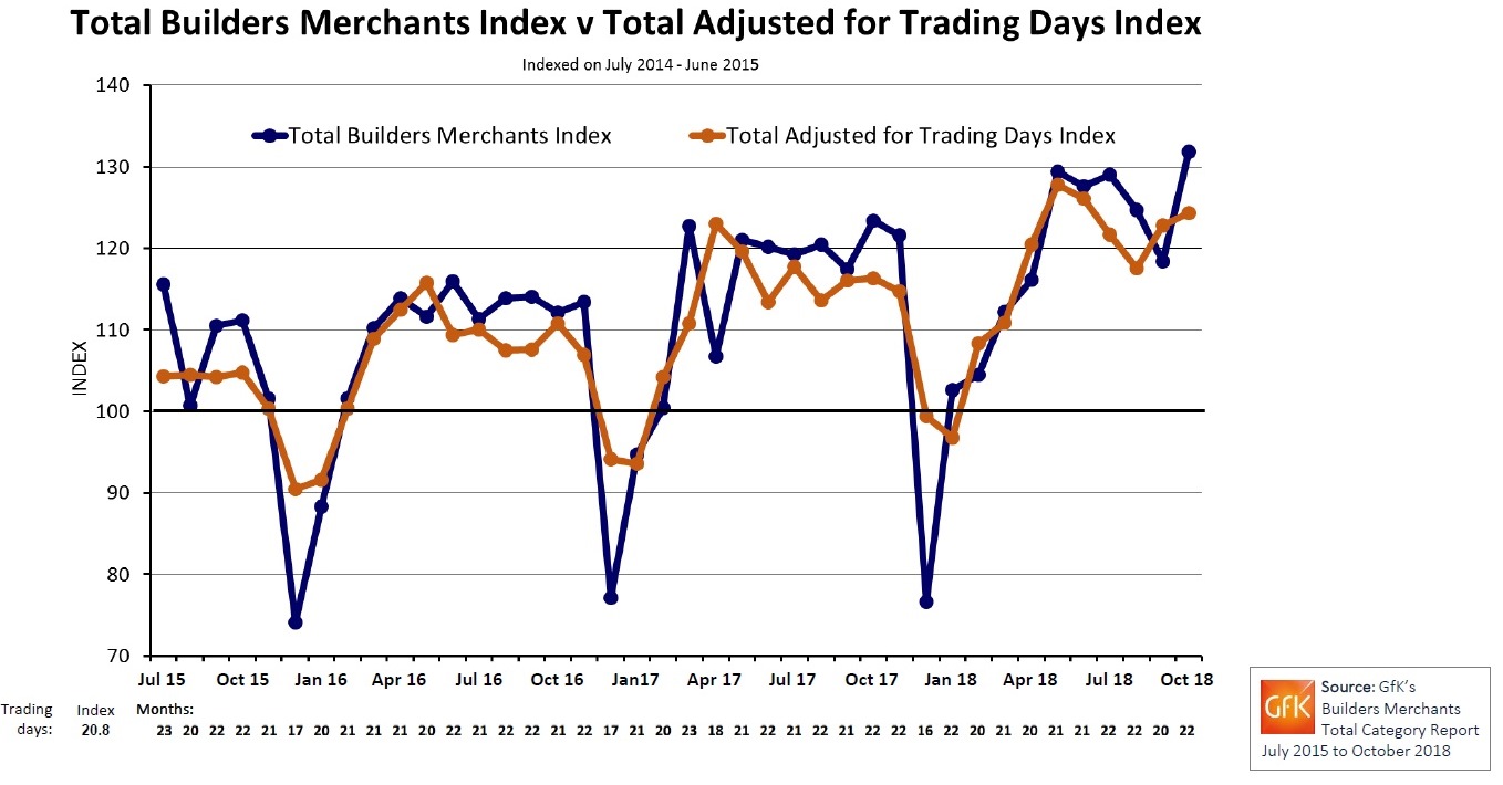 The Builders Merchant Building Index began tracking monthly sales data in July 2014, using GfK’s point of sale tracking data to capture more than 80% of the market. October 2018 sales were the highest of any month since the tracking began.