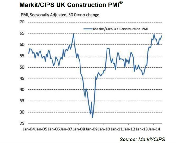 At 64.0 in August, up from 62.4 in July, the seasonally adjusted Markit/CIPS UK Construction Purchasing Managers’ Index (PMI) remained well above the neutral 50.0 threshold. It was the highest score (indicating fastest overall increase in output levels) since January 2014. The latest reading also pointed to the second-strongest rate of output expansion since the pre-recession peak seen in August 2007.
