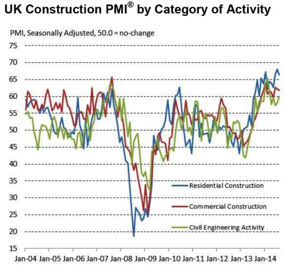 Residential construction posted the fastest rise in activity, despite the pace of expansion moderating slightly to a three-month low. Civil engineering activity increased at the strongest pace since March, while growth of commercial construction again held close to its fastest since the summer of 2007.