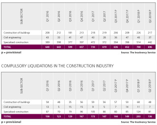Civil engineering companies appear to fare better than builders, with insolvencies virtually static, while the number of compulsory liquidations dropped 13% over the past 12 months. In contrast, specialist contractors are faring worst with a 7% rise in insolvencies and an 8% rise in compulsory liquidations.