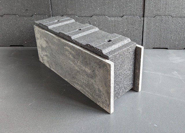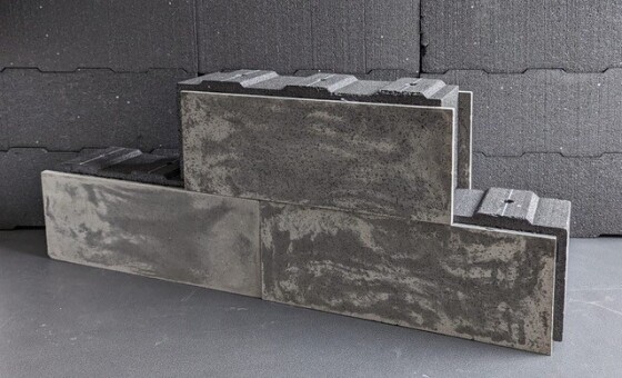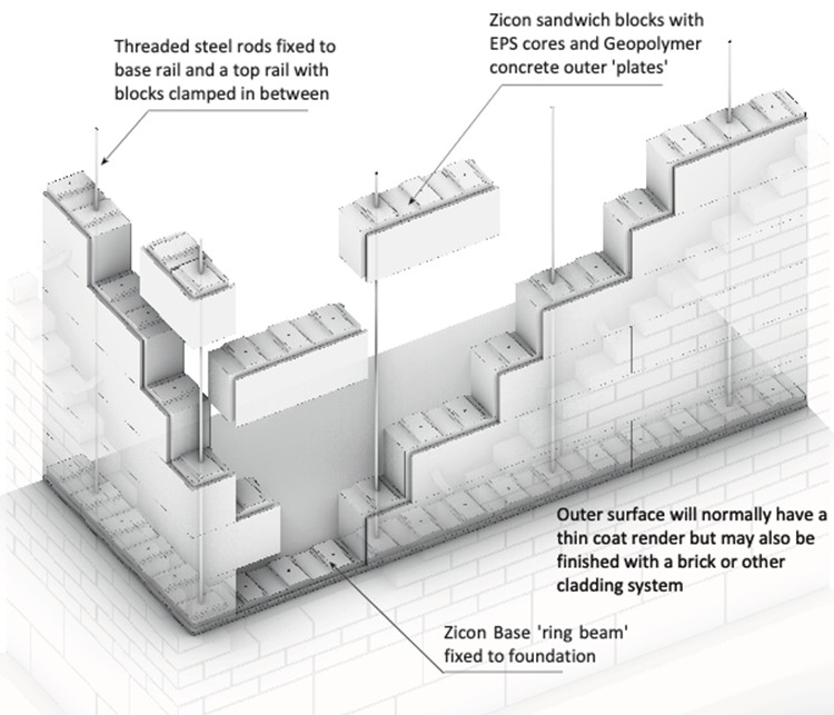The Zicon block is made of high strength geopolymer concrete using high proportions of waste materials but no cement. Its core is carbon impregnated expanded polystyrene (EPS) with positioning lugs.